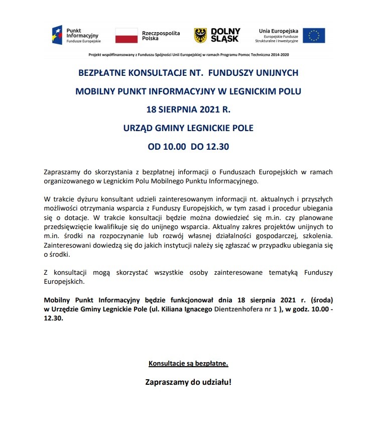 Mobilny Punkt Informacyjny będzie funkcjonował dnia 18 sierpnia 2021 r. (środa) w Urzędzie Gminy Legnickie Pole (ul. Kiliana Ignacego Dientzenhofera nr 1 ), w godz. 10.00 – 12.30.