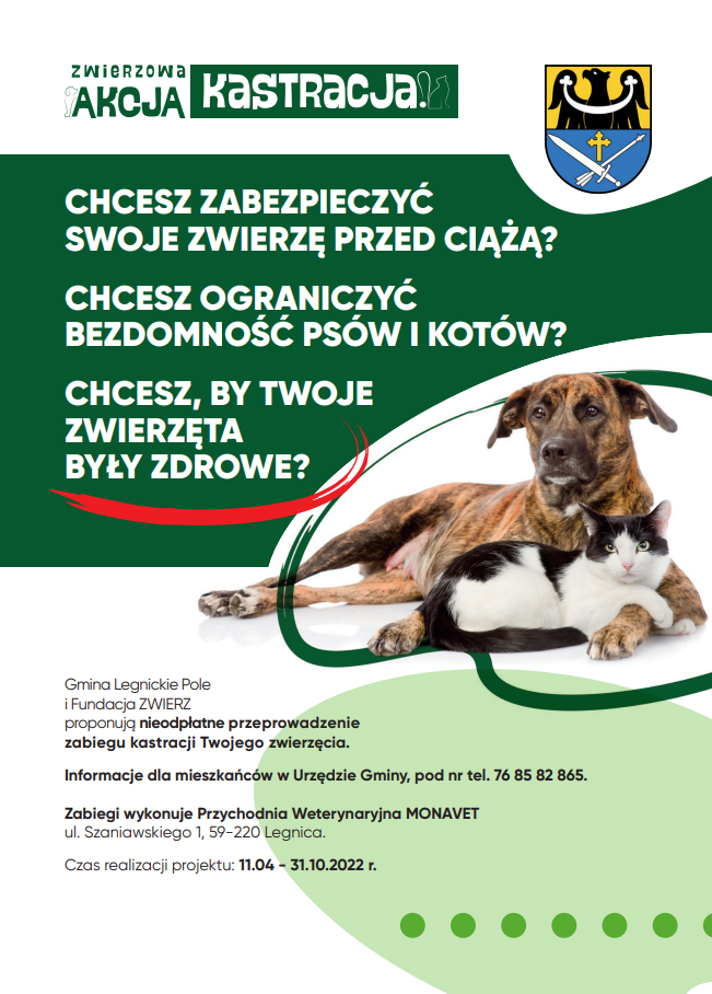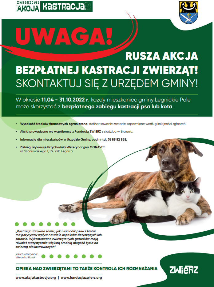 Gmina Legnickie Pole wraz z Fundacją ZWIERZ, podobnie jak w roku ubiegłym, podjęły się wspólnej realizacji projektu ZWIERZowa Akcja Kastracja! mającego na celu zmniejszenie liczby zwierząt niechcianych przez upowszechnienie przeprowadzania zabiegów sterylizacji/ kastracji u zwierząt utrzymywanych przez ich opiekunów.